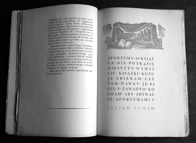 Książka O ilustracji wydana surowo, drukowana dwubarwnie na pożółkłym już dzisiaj papierze, z nieobciętym blokiem książki, jest pełna uroku za sprawą Adama Młodzianowskiego, który zadbał o jej formę. Powstała pod auspicjami Towarzystwa Miłośników Książki, więc dla krakowskich bibliofilów wyłączono ze sprzedażnego nakładu dwadzieścia pięć numerowanych egzemlparzy. Mój egzemplarz jest normalny, nienumerowany, z oberwanym grzbietem. Ale tego grzbietu nie wyrzuciłem i służy jako zakładka.