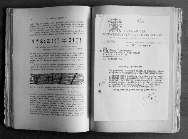 Mój ojciec bardzo chciał mieć monografię Semkowicza, szukał i szukał bez efektu. W lipcu 1967 roku spróbował zwykle skutecznej w tamtych latach metody »między nami, dyrektorami« (był wówczas dyrektorem technicznym wydawnictwa Czytelnik) i napisał list do Karola Kiecia, dyrektora Drukarni Uniwersytetu Jagiellońskiego, w której drukowano dzieło: [...] od dłuższego czasu poszukuję stale mi potrzebnej Paleografii łacińskiej Wł. Semkowicza, wydanej przez PAN, a wydrukowanej w maju 1951 (zam. 560, 1.10. 1947) w Waszej drukarni. Czy nie znalazłby się u Was jeden wolny egzemplarz tej pracy? Odpowiedź była natychmiastowa, ale smutna: [...] Z przykrością donoszę, że podręcznika tego bezskutecznie poszukują różni od kilku lat. Niestety po przebudowach i rozbudowach naszego zakładu niewiele pozostało z produkcji [...] nie posiadamy Paleografii. Tak więc ostatnia szansa okazała się złudna. Koniec końców, długo tropioną książkę ojciec dostał w prezencie od redaktora i bibliografa Adama Czachowskiego (1919–1993) i na stronie tytułowej natychmiast przybił swoją pieczątkę.