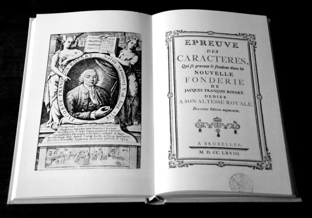 Wróćmy jednak do książki, której napisanie i publikacja bez pomocy zbiorów bibliotecznych i drukarskich Muzeum Enschedé byłyby niemożliwe. Zasadniczą jej atrakcją jest światłodrukowe faksymile wzornika czcionek Épreuve des caractères, qui se gravent & fondent dans la nouvelle fonderie de Jacques François Rosart, wydanego w Brukseli w 1768 roku. Kopię wykonano z egzemplarza brukselskiej Biblioteki Królewskiej. Katalog prezentuje rozmaity materiał zecerski. Oprócz antykw i kursyw, mamy tu pisma gotyckie, pisanki (w tym piękną lettre de civilité Grandjean’a), pisma greckie i hebrajskie, nuty, różne ozdobniki, linie, tła, ramki i akkolady. Duża część czcionek Rosarta znalazła się w posiadaniu Enschedé.