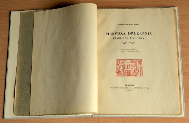 »Druk niniejszy wytłoczono nakładem Drukarni W. L. Anczyca i Spółki w Krakowie, pod kierownictwem Ferdynanda Pieradzkiego. Składał Stanisław Obłutowicz, tłoczył Wincenty Robak. Klisze wykonano z zakładzie S. Welanyka w Krakowie kosztem Marji z Horodyskich Piekarskiej. – Odbito 380 egzemplarzy, z których nr. 1–150 przeznaczono dla uczestników Drugiego Zjazdu Bibliofilów Polskich, nr. 151–270 dla członków Towarzystwa Miłośników Książki w Krakowie, nr. 271–300 wręczono Autorowi, nr. 301–330 zatrzymał nakładca, zaś nr. 331–380 oddano na sprzedaż w «Bibliofilu Polskim» antykwariacie Towarzystwa Miłośników Książki w Krakowie, przy Rynku Głównym w kamienicy Kromerowej naprzeciw Ratusza«.
